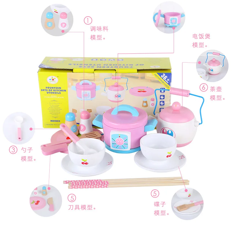 HIGH QUALITY Wooden Children Play House Kitchen Toy Tableware Set 14 Pieces Model Rice Cooker Cooking Pot Soup P